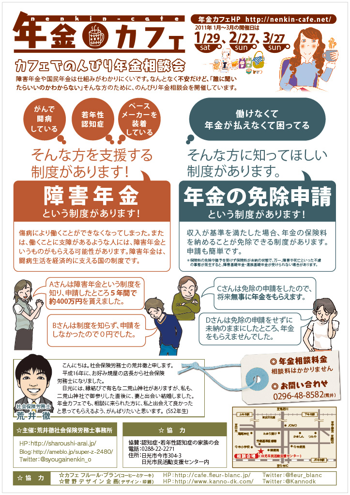 仲間と一緒に「年金カフェ」http://nenkin-cafe.net/(年金カフェは、がん、認知症、引きこもりなどの方を対象とした年金制度に関する相談会です)を運営しています。